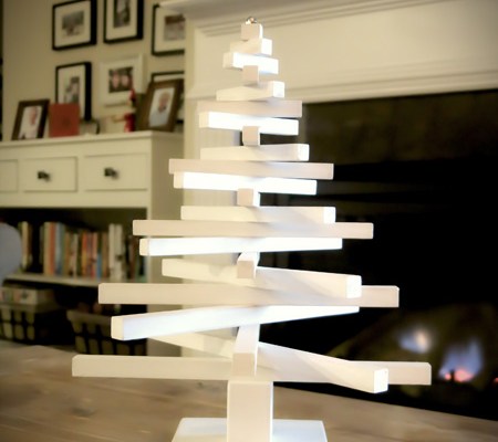 Table top Christmas tree made from 3/4 inch and 1/2 inch dowel. Steel rod through each piece and locking nuts on top and in base to hold in place. Base was made from some scrap 2 by 6.