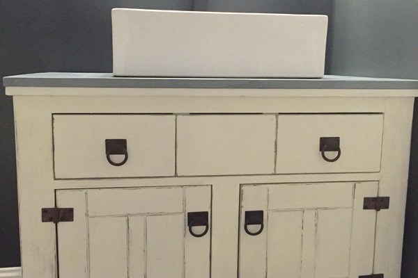 Bathroom Vanity Bathroom vanity with vessel sink. Two working outer drawers. Finished in an antique white color. Share this: Share on X (Opens in new window) X Share on Facebook (Opens in new window) Facebook Like Loading... Related