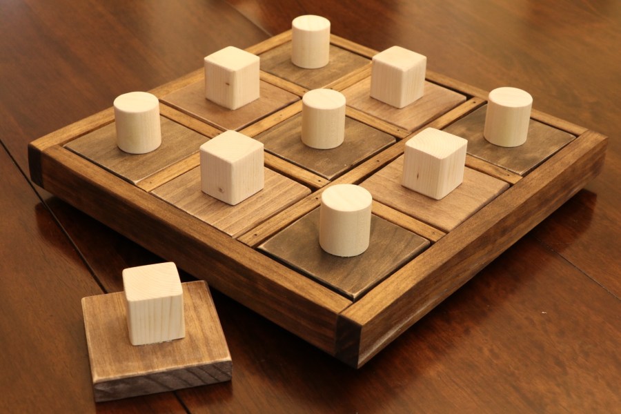 Don’t like calling it scrap as no wood should be scrap. I make things from the leftovers and then still have smaller leftovers. Inbetween building and waiting for paint to dry, I used some of the smaller leftovers to make this – not so much Tic Tac Toe or Noughts and Crosses. But more Circles and Squares…
